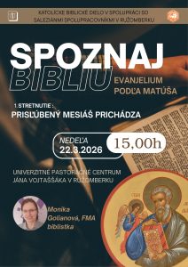 Katolícke biblické dielo v spolupráci so saleziánmi spolupracovníkmi v Ružomberku pozýva na prednášku sr. Moniky Golianovej, FMA, biblistky, z cyklu prednášok Spoznaj Bibliu. Najbližšie 4 stretnutia priblížia prítomným Evanjelium podľa Matúša.